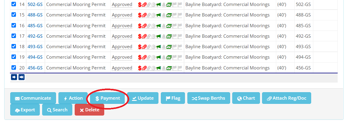 To apply the payment against outstanding charges on the selection applications, scroll to the bottom of the Search Results page and click the Payment button.