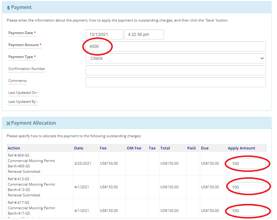 This will bring you to the Payment screen, where you can enter the total amount paid at the top, and then specify what the payment is for down below.  If the payment is for the outstanding amount, all outstanding charges will be paid.  If the payment is for more than the outstanding amount, all outstanding charges will be paid and a credit will remain for the difference.  If the payment is for less than the outstanding amount, we will attempt to pay all outstanding charges until there is no money left, and the charges at the bottom of the list will remain unpaid unless you manually edit the amounts that we should pay.