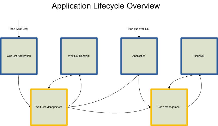 Online Mooring is highly configurable, and as a result each provider can have a different workflow for managing applications.  However, Online Mooring defines all of the possible workflows that a provider can use.  A high-level diagram of these workflows is shown below.